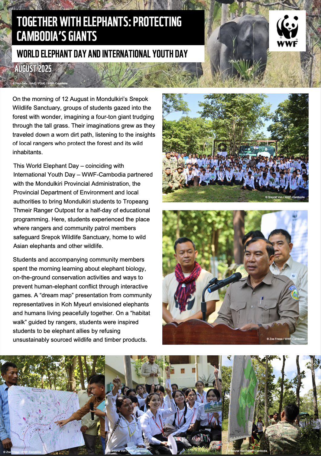 This World Elephant Day – coinciding with International Youth Day – WWF-Cambodia partnered with the Mondulkiri Provincial Administration, the Provincial Department of Environment and local authorities to bring Mondulkiri students to Tropeang Thmeir Ranger Outpost for a half-day of educational programming. Here, students experienced the place where rangers and community patrol members safeguard Srepok Wildlife Sanctuary, home to wild Asian elephants and other wildlife.