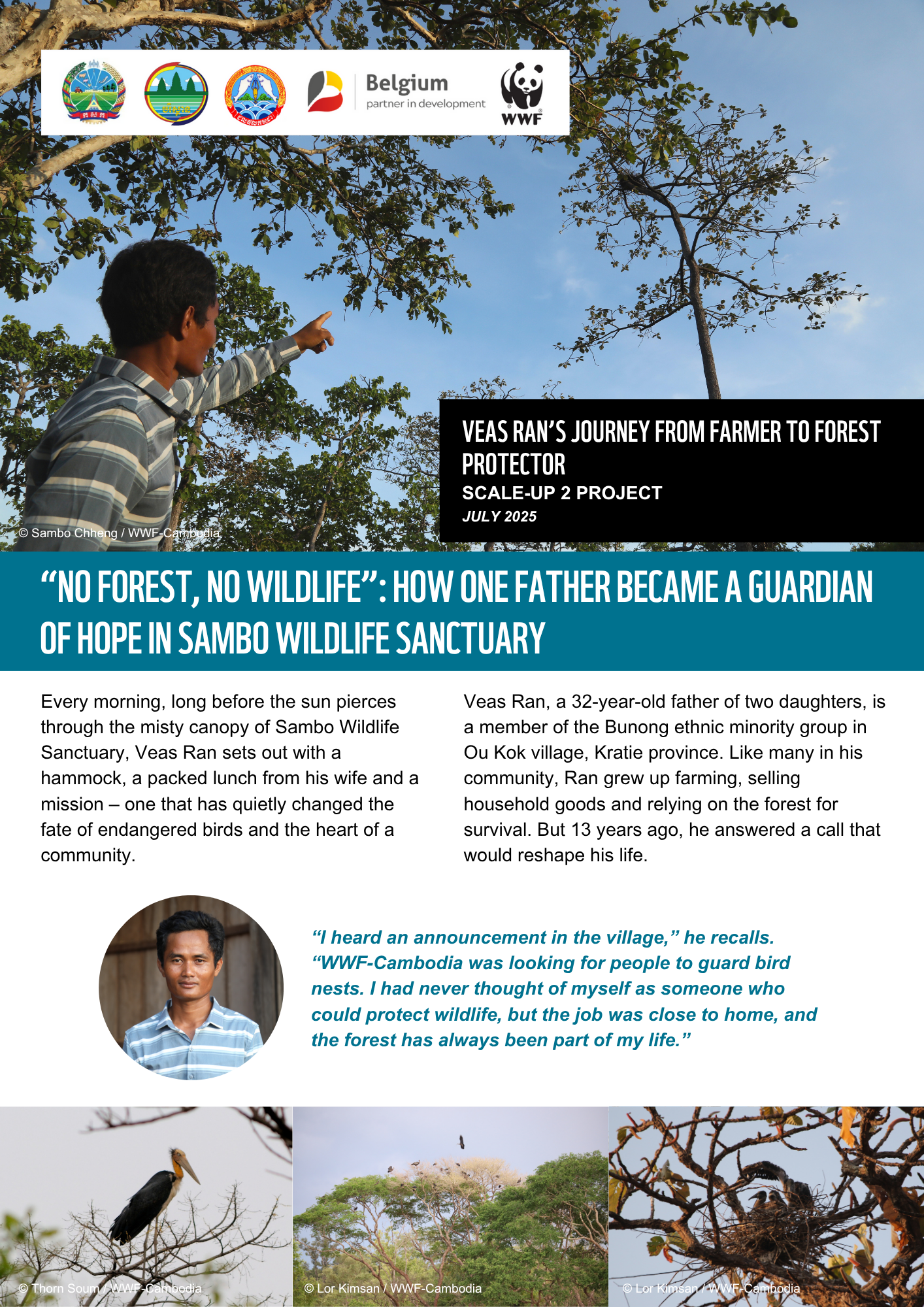 Every morning, long before the sun pierces through the misty canopy of Sambo Wildlife Sanctuary, Veas Ran sets out with a hammock, a packed lunch from his wife and a mission – one that has quietly changed the fate of endangered birds and the heart of a community.
